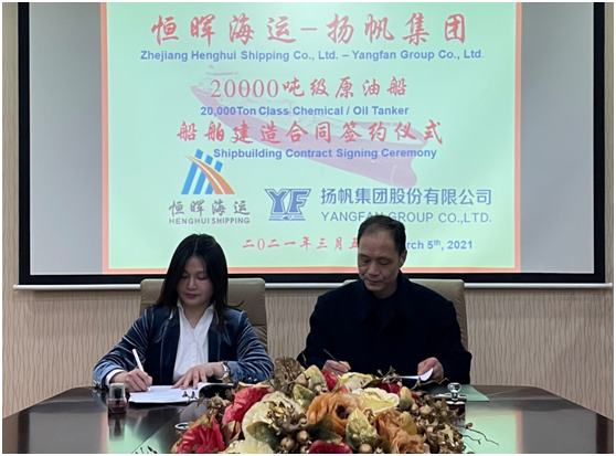2021年3月5日,揚(yáng)帆集團(tuán)股份有限公司與浙江恒暉海運(yùn)有限公司成功簽約1艘20000噸級原油船建造合同。該合同是繼2019年12月30日揚(yáng)帆集團(tuán)與恒暉海運(yùn)簽署1艘18000噸成品油/化學(xué)品船建造合同后的第二次成功合作。