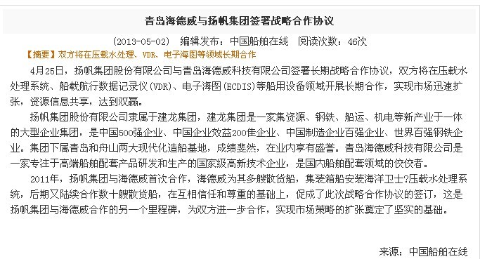中國(guó)船舶在線:青島海德威與揚(yáng)帆集團(tuán)簽署戰(zhàn)略